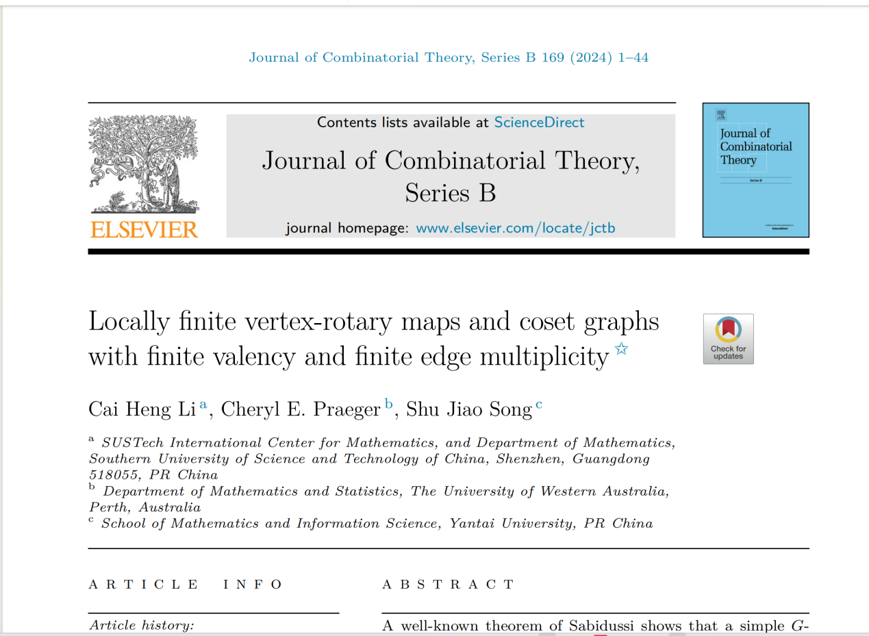 近日,數(shù)學(xué)與信息科學(xué)學(xué)院宋淑嬌教授與南方科技大學(xué)李才恒教授以及西澳大學(xué)Cheryl Praeger合作新構(gòu)建了一類具有重邊的陪集圖,并以此工具分類刻畫了弧傳遞地圖。相關(guān)研究成果以“Locally finite vertex-rotary maps and coset graphs with finite valency and finite edge multiplicity”為題發(fā)表在組合圖論領(lǐng)域的頂級(jí)期刊《Journal of Combinatorial Theory,Series B》上。