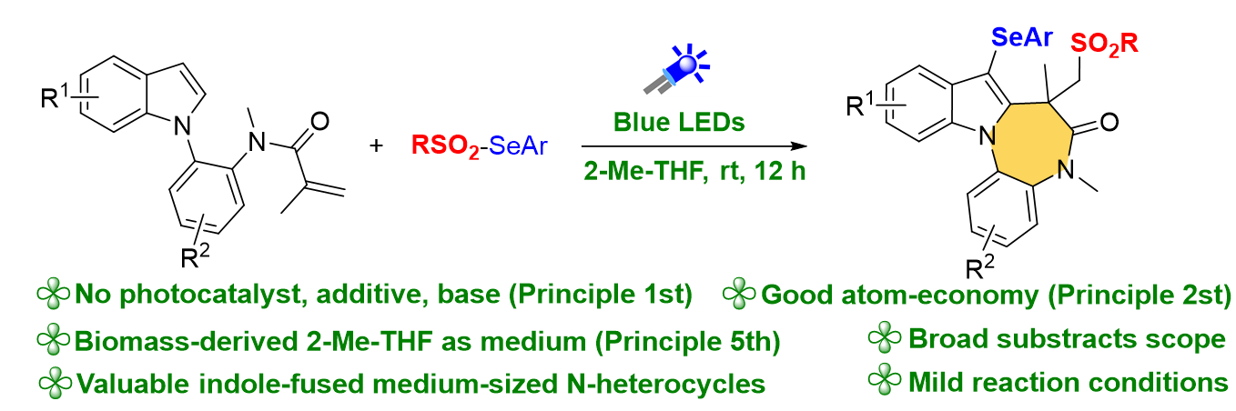 目前,常見構(gòu)筑吲哚并氮雜中環(huán)化合物的方法主要是通過過渡金屬(Pd、Rh、Ru)催化交叉偶聯(lián)的[5+2]環(huán)化策略實(shí)現(xiàn)。然而,昂貴過渡金屬催化劑和復(fù)雜配體的使用極大地限制了該方法在合成中的實(shí)際應(yīng)用?;谶胚岵⒌s中環(huán)化合物在藥物研發(fā)中的重要意義,以及本課題組在自由基引發(fā)環(huán)化化學(xué)領(lǐng)域的持續(xù)探索,煙臺大學(xué)孫凱、徐鑫明、田苗等人報道了一種新型的可見光誘導(dǎo)磺?;?環(huán)化-硒化反應(yīng)。該反應(yīng)通過可見光誘導(dǎo)(遵循綠色化學(xué)第六項(xiàng)"能量效率優(yōu)化"原則)的均裂途徑,同步產(chǎn)生親電性磺酰基自由基與中性硒自由基,進(jìn)而在無添加劑、無堿、無外源性光敏劑(遵循綠色化學(xué)第一項(xiàng)"污染預(yù)防"原則)的條件下,采用生物質(zhì)溶劑2-Me-THF(符合第五項(xiàng)"安全溶劑"原則),實(shí)現(xiàn)了具有原子經(jīng)濟(jì)性的磺酰化-環(huán)化-硒化三級串聯(lián)反應(yīng),為構(gòu)建結(jié)構(gòu)復(fù)雜的吲哚并氮雜中環(huán)化合物提供了普適性合成策略。