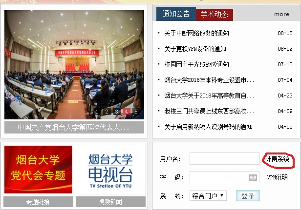 在瀏覽器中打開煙臺大學官網http://www.3zjsyhu.xyz,點擊右下“計費系統”