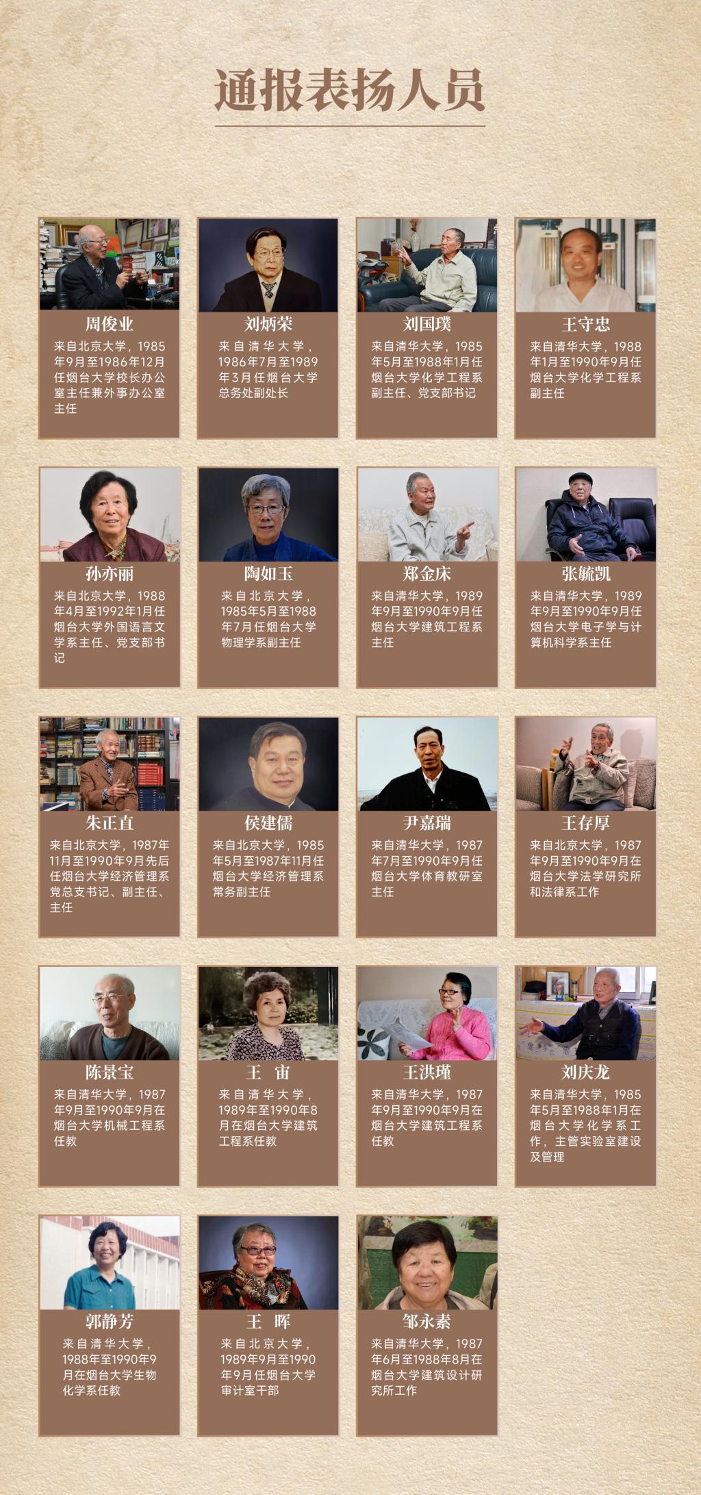 為了表彰北京大學、清華大學在煙臺大學工作的同志作出的突出貢獻,省政府決定:給沈克琦、杜建寰、楊春洗、錢振為、賀崇鈴等五位同志記大功,給翁樟等十三位同志記功,對周俊業等十九位同志通報表揚。