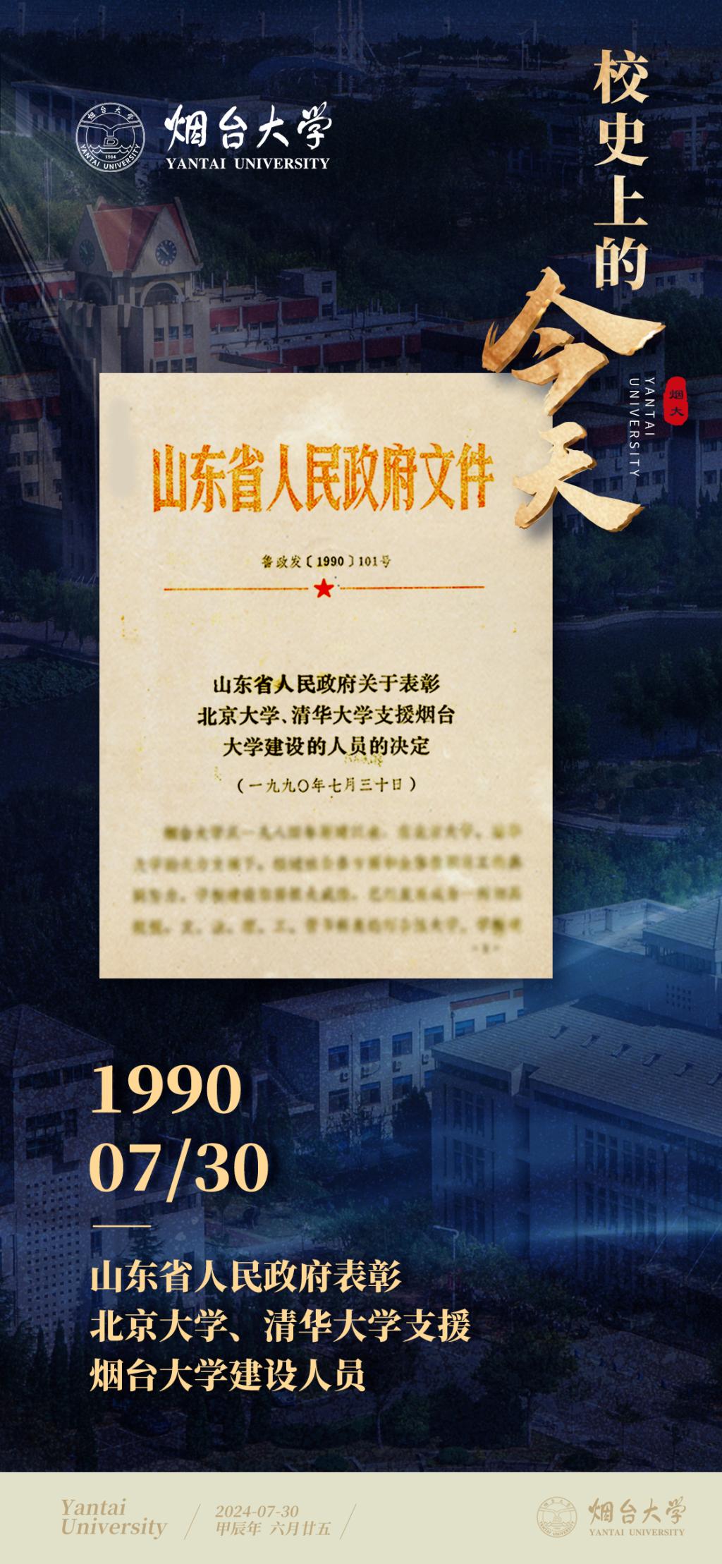 1990年7月30日,山東省人民政府以魯政發〔1990〕101號文件下發《關于表彰北京大學、清華大學支援煙臺大學建設的人員的決定》。文件指出,煙臺大學從一九八四年籌建以來,在北京大學、清華大學的大力支援下,經過社會各方面和全體教職員工的共同努力,學校建設取得很大成績,已經發展成為一所初具規模,文、法、理、工、管多科類的綜合性大學。學校建設速度快、起點高,為今后進一步提高和發展奠定了良好的基礎,為山東高等教育發展和人才培養作出了積極貢獻。