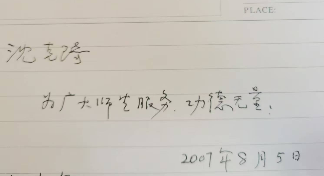 沈克琦校長為張金龍老師題寫“為廣大師生服務(wù),功德無量”