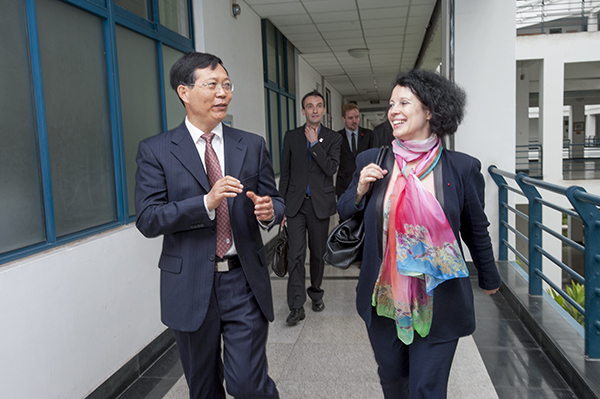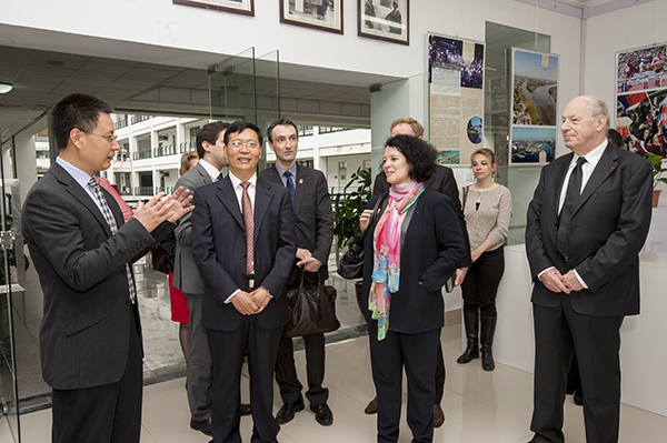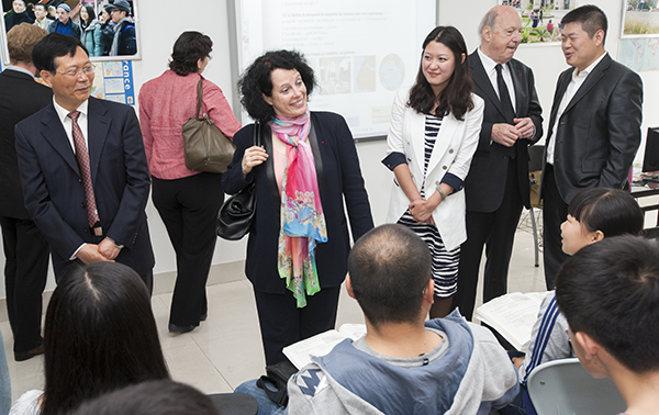 上午8時30分,白林大使一行抵達煙臺大學法語中心,崔書記代表學校歡迎白林大使的到訪,并感謝大使對煙臺大學的關注和支持。崔書記陪同大使一行,參觀了法語中心,介紹了法語中心的情況。崔書記說,作為煙臺大學對法交流的平臺和橋頭堡,煙臺大學法語中心自2010年6月成立以來,在中、法多方的協助和支持下,廣泛深入調研,制定發展規劃,聘用具有豐富法語教學經驗的中法兩國的教師任教,開辦了多期培訓班,受到了廣大學員的認可和青睞;該中心還舉辦了一系列的文化活動,例如法國電影節、法國漫畫展、法國書畫展、藝術家講座和紀念中法建交五十周年文化活動等。崔書記還介紹了我校與法國高校的交流交往以及我校參與共建法國盧瓦爾孔子學院(昂熱)的情況。