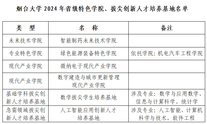 【本站訊】日前,山東省教育廳等5部門公布了2024年山東省特色學院和拔尖創新人才培養組織實施高校名單,煙臺大學申報的6個省級特色學院、拔尖創新人才培養基地全部獲批。其中,智能制藥未來技術學院獲批省級未來技術學院,綠色能源裝備特色學院獲批省級專業特色學院,微納電子現代產業學院、數字建造與城市更新管理現代產業學院獲批省級現代產業學院。數學拔尖學生培養基地獲批省級基礎學科拔尖創新人才培養基地,人工智能應用創新人才培養基地獲批省級急需領域拔尖創新人才培養基地。