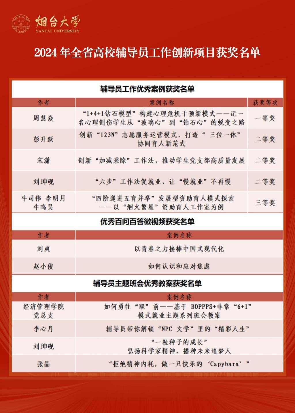 【本站訊】4月29日,中共山東省委教育工委公布了2024年全省高校輔導員工作創(chuàng)新項目評選結(jié)果,煙臺大學共獲獎11項,其中輔導員工作優(yōu)秀案例一等獎1項、二等獎3項、三等獎1項,優(yōu)秀百問百答微視頻2項,輔導員主題班會優(yōu)秀教案集體項目1項、個人項目3項。