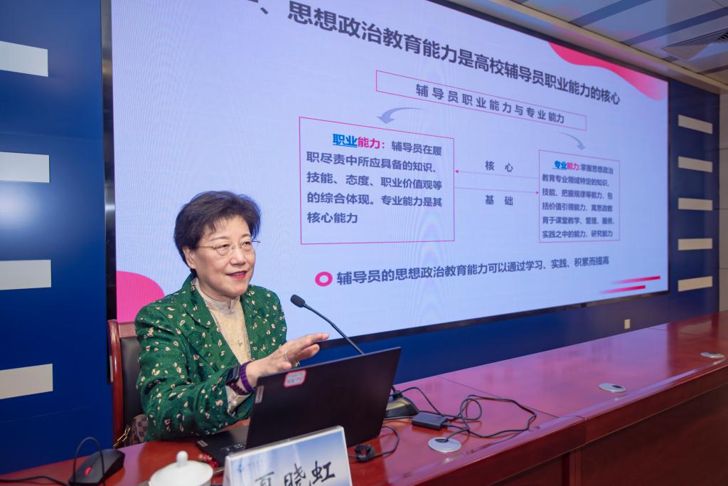 夏曉虹教授從“高校輔導員的思想政治教育能力”“輔導員在專業能力提升中的‘憂’與‘愁’”“勤學善思,勤耕善研,主動提高勝任力”三個維度,深入剖析了輔導員專業能力提升與職業發展的核心要點。她鼓勵輔導員扎根日常思想政治教育工作,持續提升職業能力和專業技能;提高政治素養,明晰職業價值觀,培養主動學習的意識與創新思維,充分釋放育人潛力;勤學善思、勤耕善研,緊盯學術前沿,精準把握創新點,善用數據分析,積極提升工作勝任力。報告深入淺出、案例豐富,為我校輔導員專業能力提升提供了“方法論寶庫”。