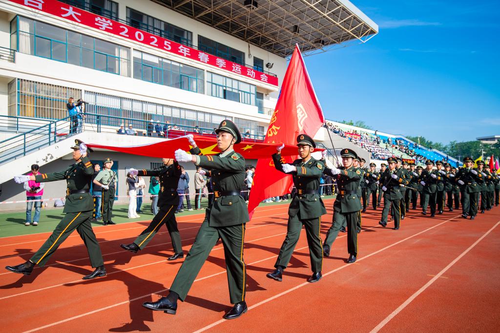 鼓聲歡騰、云旗招展,運動員入場式在激昂的音樂聲中進行,由國旗方隊、彩旗方隊以及各學院、各單位組成的28個方隊,踏著整齊劃一的步伐走過主席臺。各學院方陣以創意隊列和表演充分展現學院特色,贏得現場觀眾的熱烈歡呼。國旗護衛隊護送國旗入場,全場師生肅立行注目禮。隨著《義勇軍進行曲》奏響,五星紅旗在朝陽中冉冉升起,拉開本屆運動會的序幕。